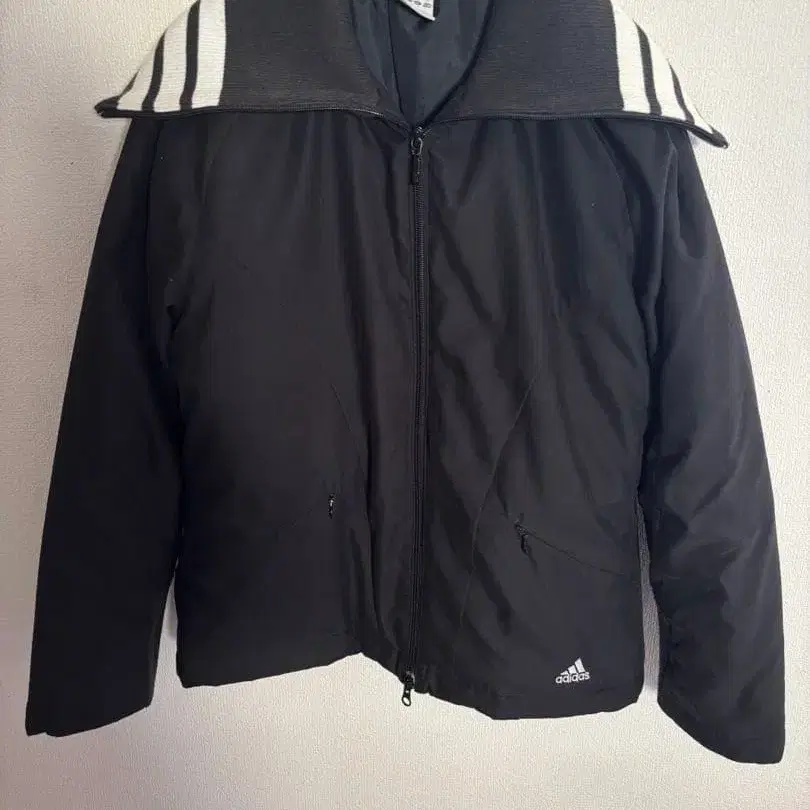 스트라이프 옷깃이 있는 블랙 점퍼, adidas 제품.