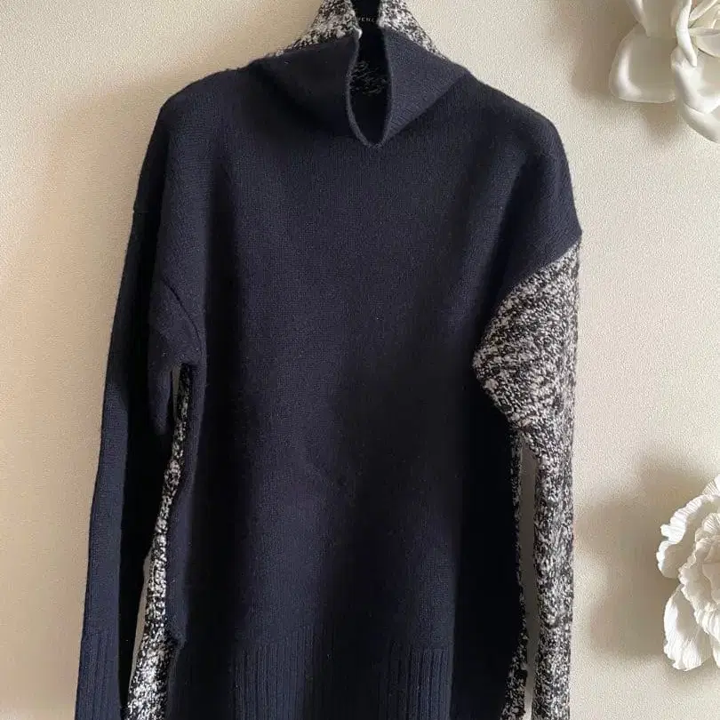 JOSEPH 양모 니트입니다. 앞뒤로 네이비와 서리 내린 듯한 2가지 패턴으로 착용이 가능합니다. 양모 84%의 매우 따뜻한 니트입니다.