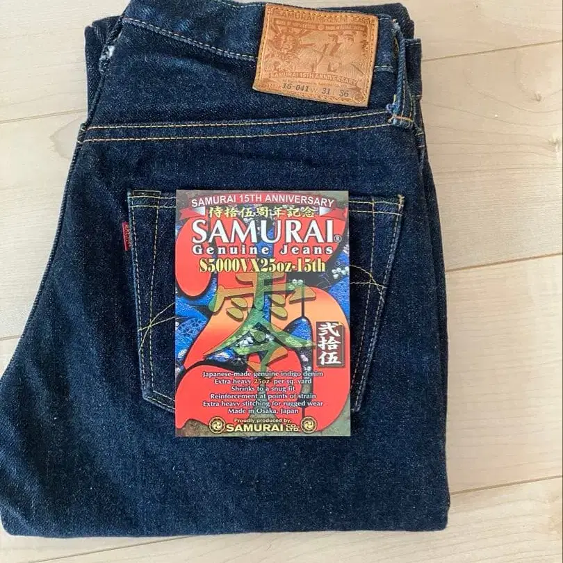 사무라이 진 15주년을 기념하여 제작된 사무라이 최초의 25oz 청바지 영 모델입니다. 프론트 버튼은 골드 컬러 사양이며, 셀비치 또한 일반 모델과는 다른 스페셜 사양으로 되어 있습니다. 약간의 색빠짐과 오른쪽 다리 밑단 스티치가 일부 풀려 있으니 확인 부탁드립니다. 31inch 허리 38cm 허벅지 폭 26cm 인심 70cm 밑단 폭 21cm 입니다. 개인 측정으로 인해 약간의 오차가 있을 수 있습니다.