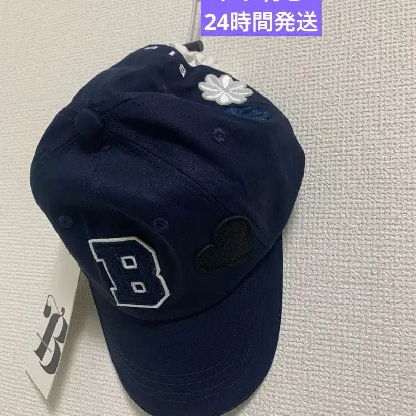 네이비 블루 야구 모자, 하트와 꽃 자수 디자인.
