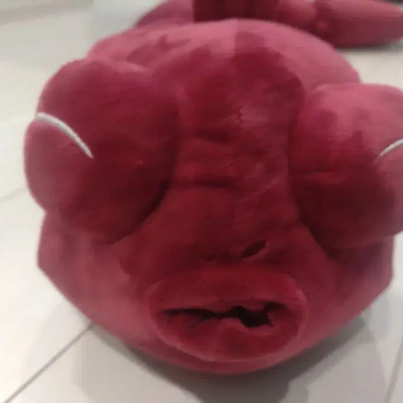 부드러운 빨간색 물고기 모양 봉제 인형, 긴 몸통이 특징입니다.