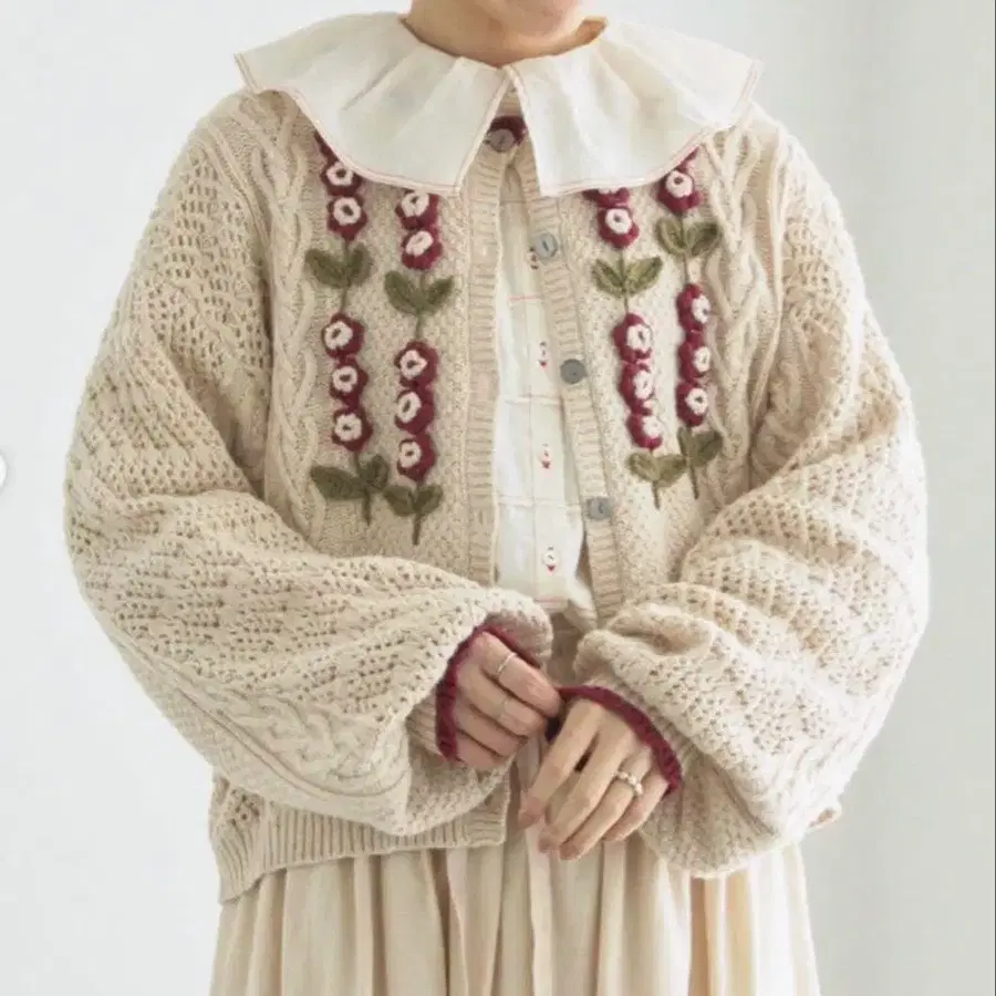 • 사만사 모스모스 루프 꽃 무늬 자카드 니트 가디건 모리걸 미색 (435