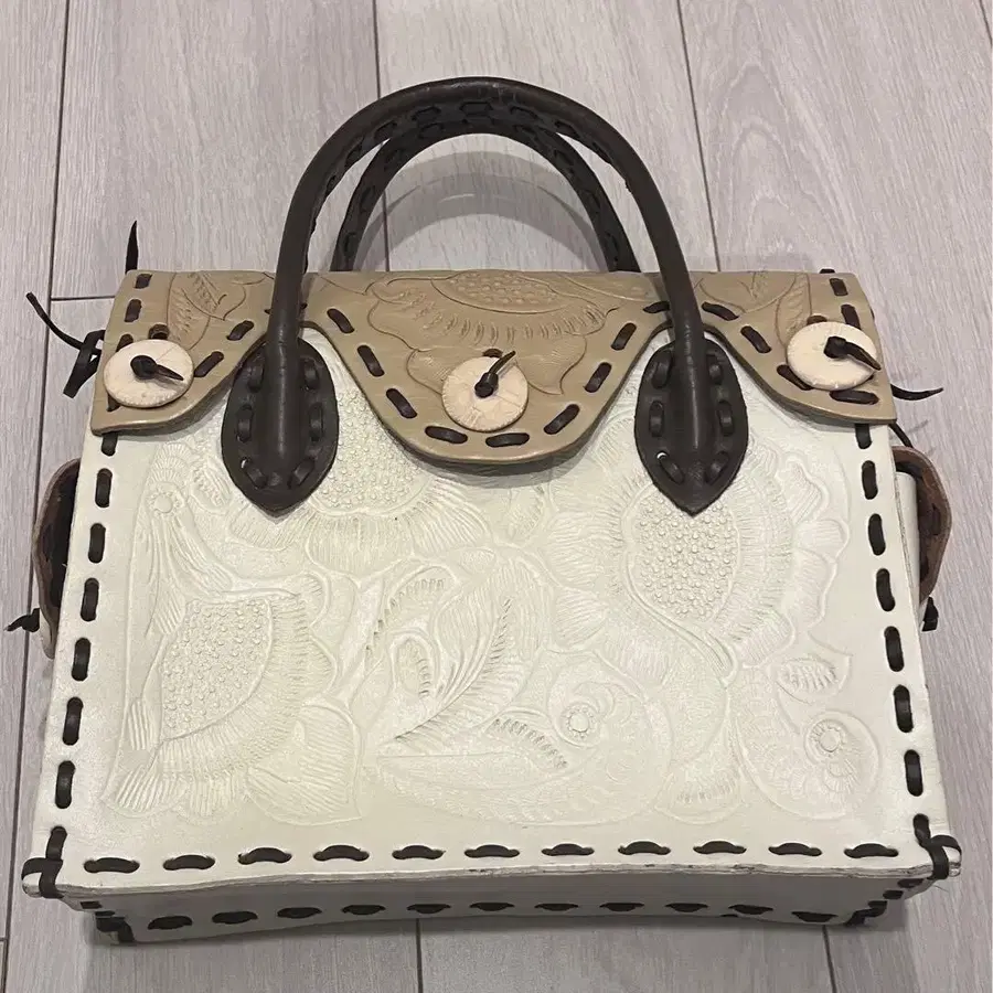 화이트를 기본으로 베이지가 들어가 있으며, 스티치가 다크 브라운으로 되어 있습니다.
