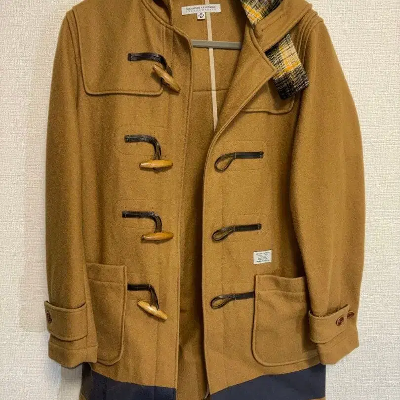 울 혼방 카멜 색상 더플 코트, 체크 무늬 안감과 탈부착 가능한 후드 부착. - 색상: 카멜 - 디자인: 더플 코트 - 소재: 울 혼방 - 후드: 탈부착 가능 - 안감: 체크 무늬 - 포켓: 앞면에 2개 - 밑단 디자인: 네이비 색상 절개 - 버튼: 토글 버튼 방문해 주셔서 감사합니다. 사이즈 - M 기장 82 소매 길이 63 어깨 너비 44
