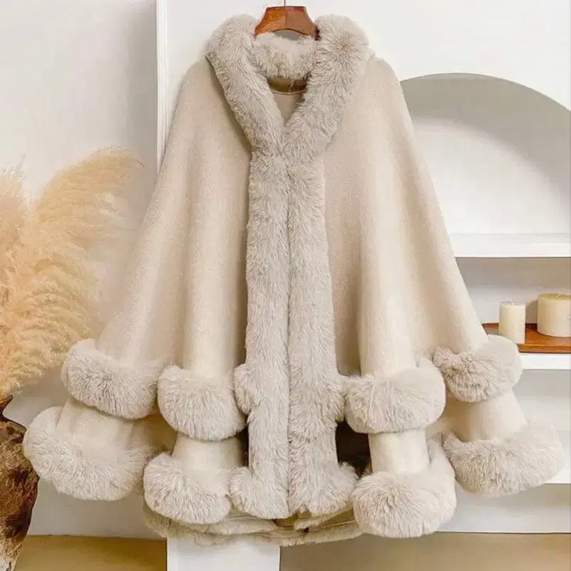 플리스 소재의 크림색 판초, 퍼 장식이 달려 있어 따뜻하며, 모자 꽁지 장식이 특징입니다.