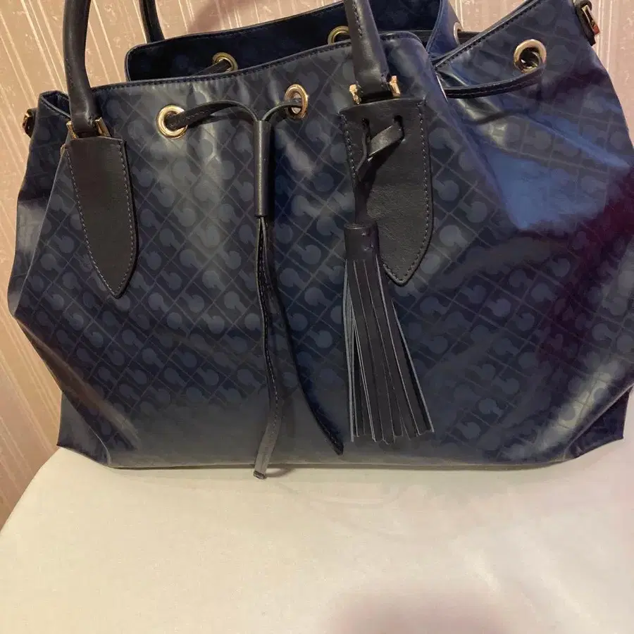 네이비 색상의 합성 피혁 토트백, 태슬이 달린 스타일리시한 디자인. - 색상: 네이비 - 디자인: 로고 - 소재: 합성 피혁 - 특징: 태슬 포함 - 핸들: 더블 핸들 사이즈 가로 43cm 높이 30cm 바닥 폭 14cm 방문해 주셔서 감사합니다.