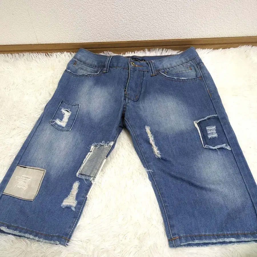 상태: 중고 데미지 데님입니다. 상태는 이미지를 확인하신 후 구매 부탁드립니다. 뒷 포켓, 데미지 가공 뒷부분에 플레이트가 달려 있습니다. (이미지 3번째)