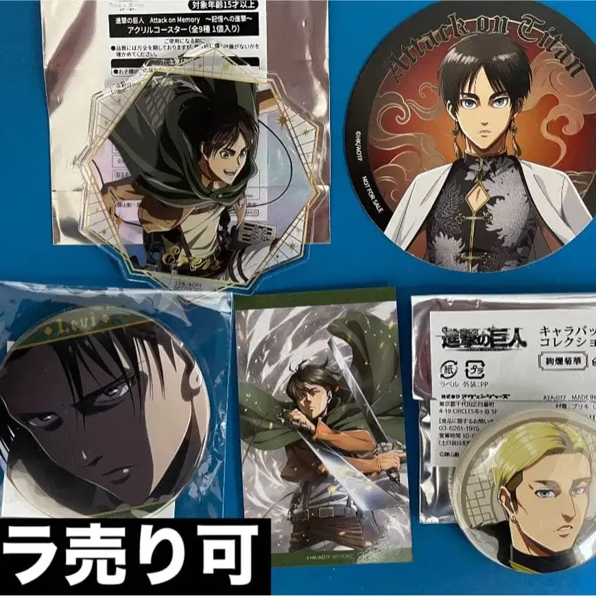 새해 복 많이 받으세요!! 진격의 거인 기억으로의 진격, 진격반점 관련 굿즈 5점 일괄 판매합니다. 낱개 판매 OK입니다. 원하시는 분은 갖고 싶은 굿즈와 금액을 댓글란에 남겨주시면 상담해 드리겠습니다. 기억으로의 진격 (조사병단 의상) 엘렌 코스터 1점 미니게임 가라폰 B상 리바이 76mm 대형 캔뱃지 1점 C상 리바이 비주얼 시트 1점 진격반점 (콜라보 한정 의상. 사진 2장째) 엘렌 코스터 1점 엘빈 캔뱃지 1점 이상입니다. 잘 부탁드립니다.