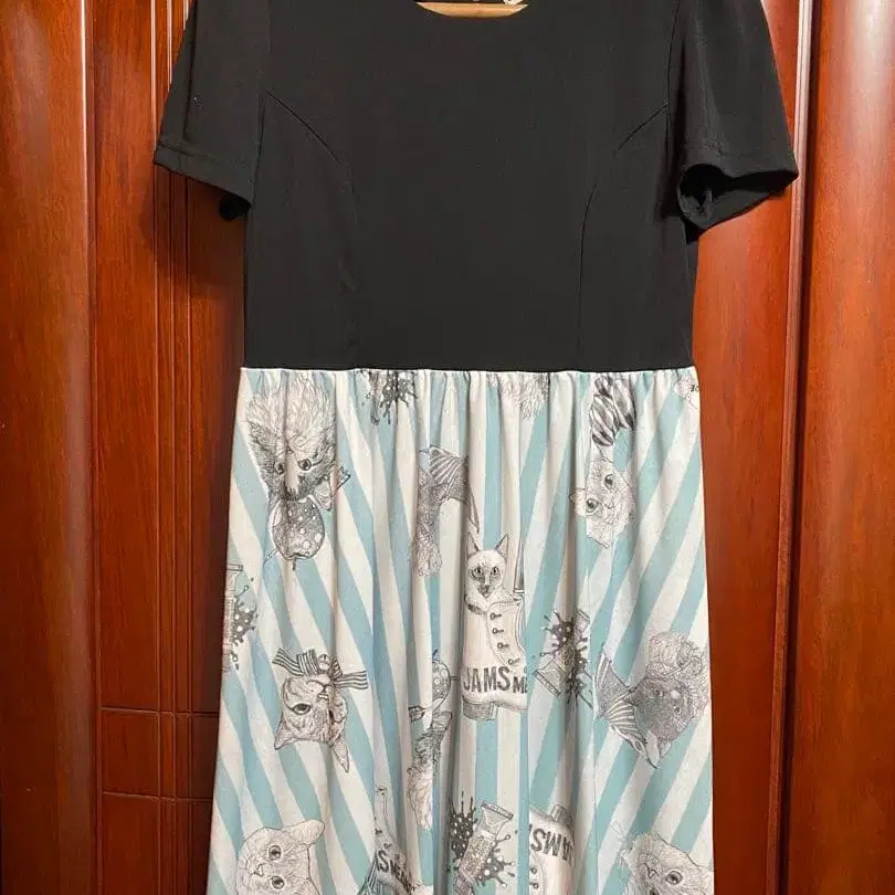 반팔 블랙 탑과 스트라이프 고양이 패턴 스커트가 특징인 원피스.