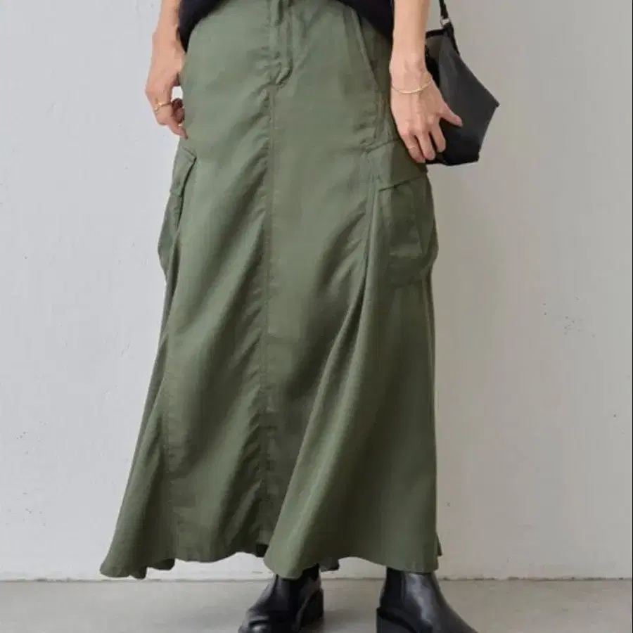 올리브 컬러의 심플한 롱 스커트, 사이드 포켓이 있어 실용적입니다.