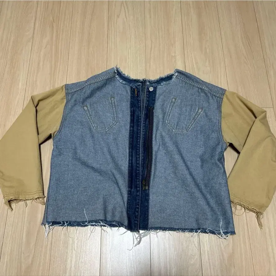 데님 블루와 베이지 캐주얼 자켓, 프린지 밑단과 포켓 부착. 리버서블 - 색상: 데님 블루와 베이지 - 디자인: 프론트 오픈, 프론트 지퍼 - 스타일: 캐주얼, 릴랙스 핏 - 소재: 데님과 코튼 혼방 - 특징: 프린지 밑단, 포켓 부착 방문해 주셔서 감사합니다. 사이즈 - FREE SIZE