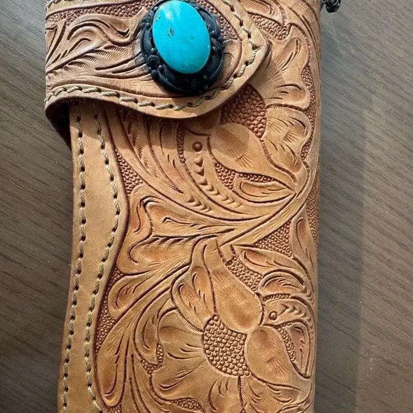 자동 번역되었어요. 원문보기엠보싱 가공된 꽃무늬 디자인과 터콰이즈 버튼이 특징인 가죽 장지갑.