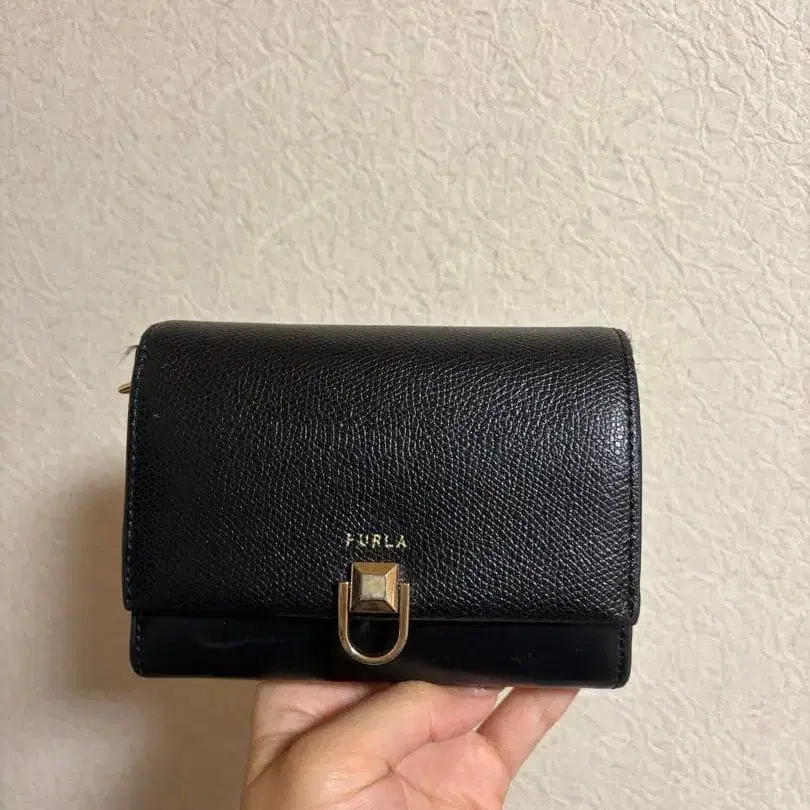 고품질 가죽 소재의 FURLA 블랙 접이식 지갑입니다. 금장 장식으로 여닫는 방식으로 사용하기 편리한 디자인입니다.