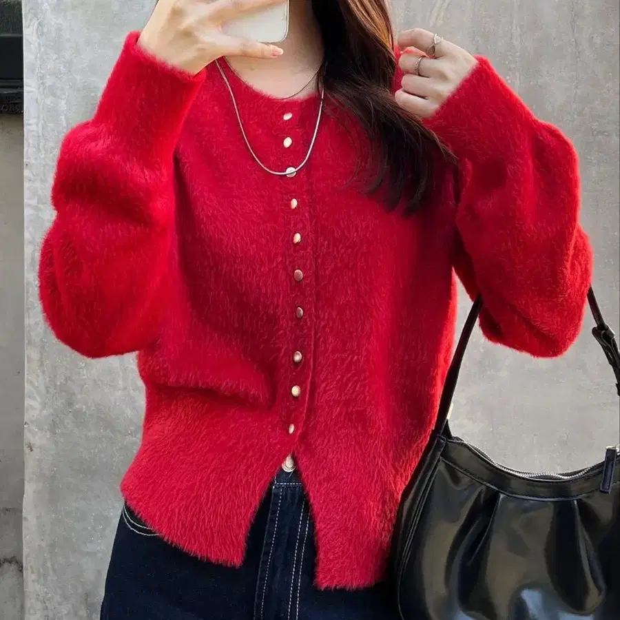 골드 버튼 밑단 슬릿 샤기 니트 가디건 레드
