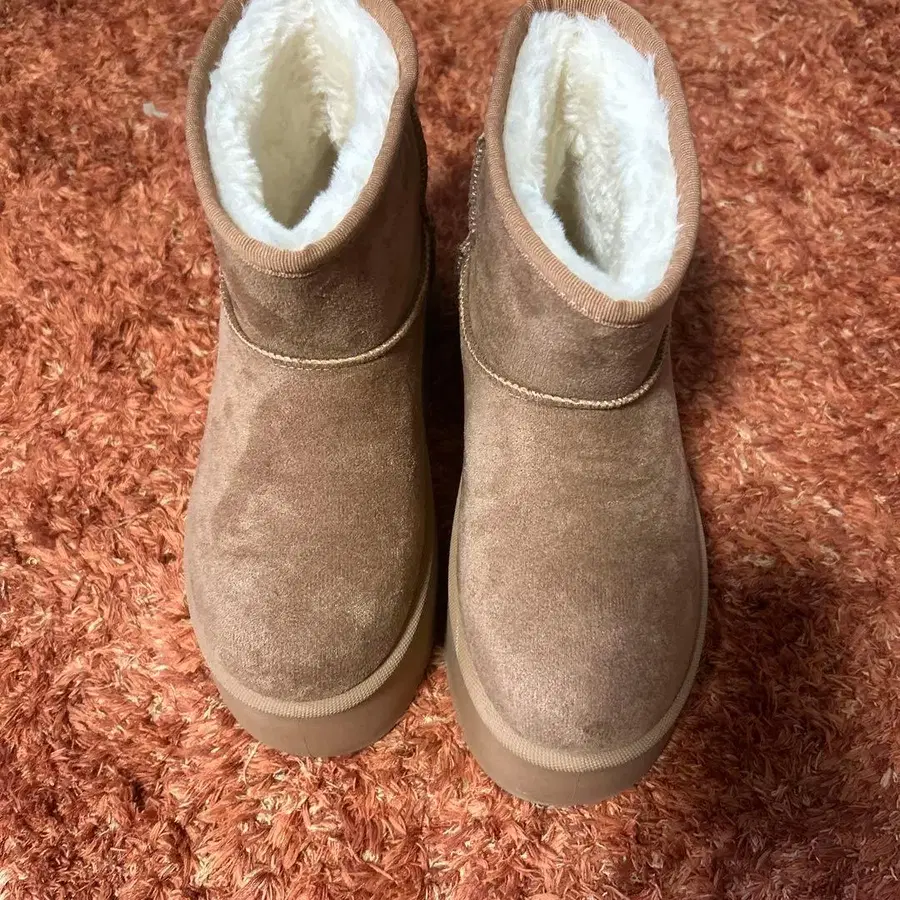 스웨이드 소재의 베이지 어그 부츠, 퍼 내부로 쾌적한 착용감. - 색상: 베이지 - 소재: 스웨이드 - 밑창 디자인: 러버 솔 - 내부: 퍼 - 스타일: 어그 부츠 방문해 주셔서 감사합니다. 사이즈 - 23.5cm 구매했는데 24cm인 저에게는 조금 끼었습니다. 아직 깨끗한 상태일 때 누군가 신어주시면 좋겠습니다. 1시간 정도밖에 신지 않았습니다. 댓글 없는 구매 OK입니다.