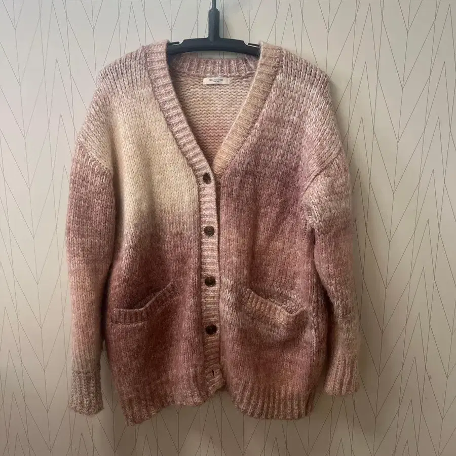 핑크 계열의 버튼이 달린 가디건, 앞면에 포켓이 있어 따뜻한 니트 소재입니다.