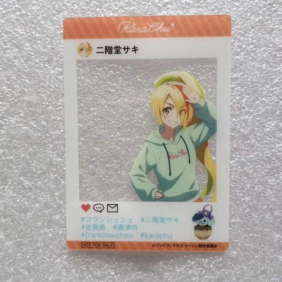 좀비랜드 사가 리벤지 KARACHU 카라츠 순회 캠페인의 스탬프 랠리에서 받은 SNS풍 클리어 카드입니다. SNS풍 클리어 카드 [ 니카이도 사키 ] 1장 구김 방지 등을 하여 발송합니다. 즉시 구매 OK입니다.