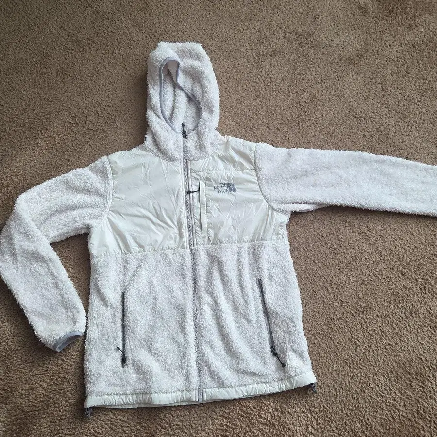 플리스 소재의 화이트 자켓, 후드 부착으로 따뜻함을 제공합니다.
