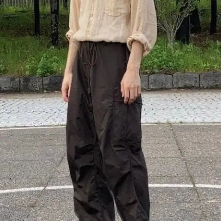 나일론 소재의 다크 브라운 카고 팬츠, 드로우 스트링 허리 포함. - 브랜드: AURALEE - 색상: 다크 브라운 - 스타일: 카고 팬츠 - 디자인: 드로우 스트링 허리 - 소재: 나일론 방문해 주셔서 감사합니다. 사이즈 - 1 허리: 34cm 밑위: 29cm 인심: 69cm
