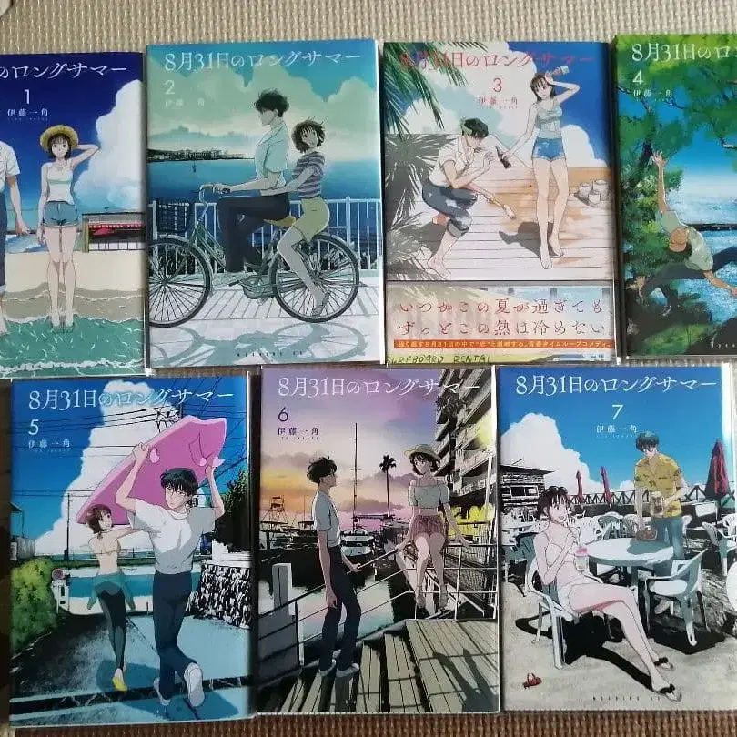 8월 31일의 롱 서머 7권 세트입니다. 3권만 오비가 있습니다. 모두 투명 북커버를 씌운 상태입니다.
