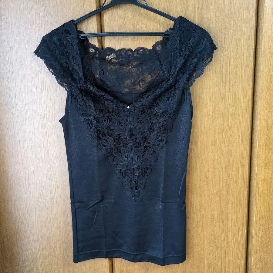 레이스 장식이 특징인 블랙 이너. - 색상: 블랙 - 소재: 레이스와 스무스 원단 - 디자인: 레이스 장식 V넥 새상품입니다. 방문해 주셔서 감사합니다.