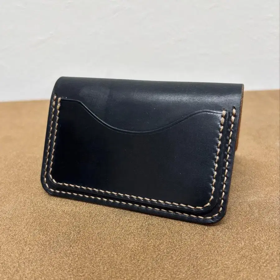 총 손바느질로 제작한 카드 케이스입니다. 외장은 호윈사제 크롬엑셀, 내부는 MARYAM사제 호스버트, 외부 포켓은 신희피혁사제 코도반을 사용했으며, 전체적으로 토코 처리를 했습니다.