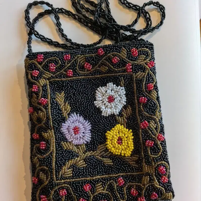 비즈 자수로 꽃무늬를 장식한 블랙 파우치.