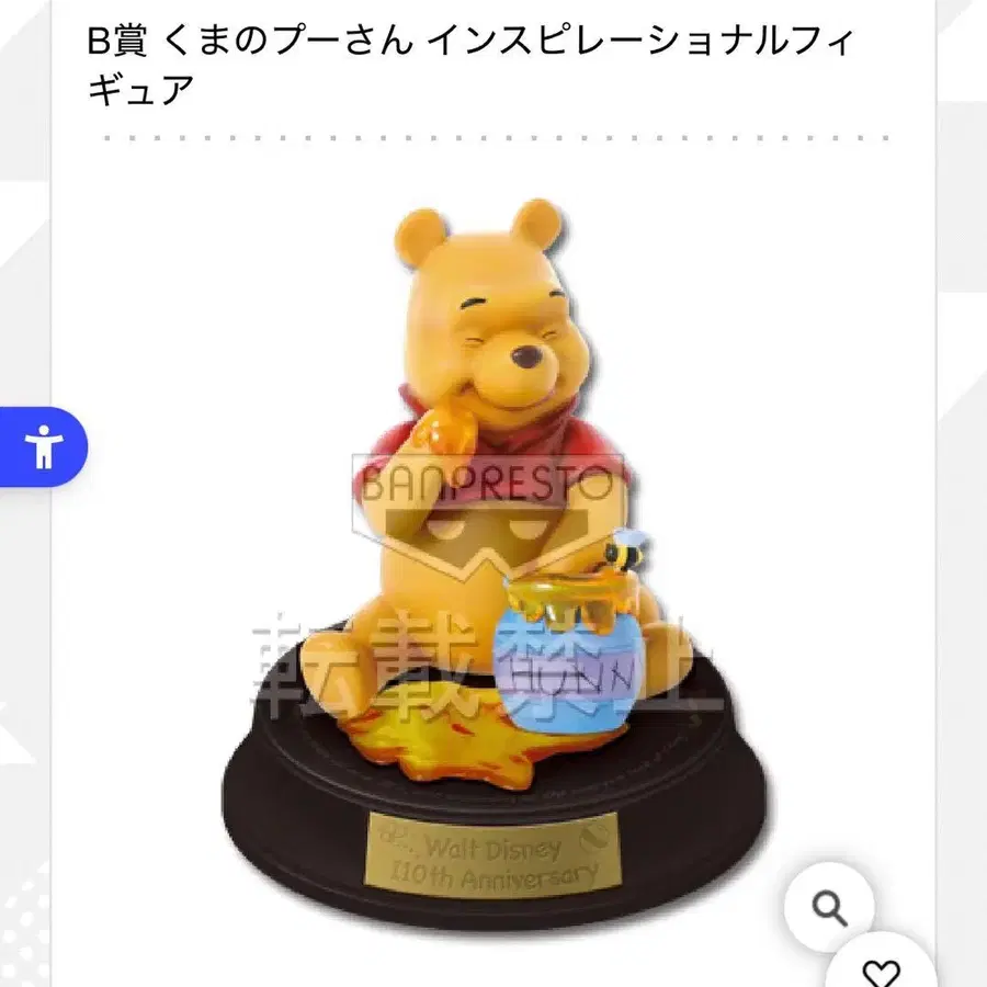 B상 곰돌이 푸 인스피레이셔널 피규어 --- 한 번 개봉했지만, 그 이후 상자에 넣어 보관했습니다. 노클레임/노리턴 부탁드립니다. 꿀을 먹으며 기뻐하는 듯한 표정의 푸우 피규어입니다. 받침대에는 '행복이란 마음의 상태를 말하는 것. 단지 사물을 어떻게 보느냐에 달려있다'는 월트의 말이 프린트되어 있으며, 꿀에 둘러싸여 행복해 보이는 푸우가 그 말의 의미를 이야기하고 있습니다. 꿀은 클리어 소재로 만들어져 맛보고 싶을 정도로 맛있어 보입니다. 푸우가 안고 있는 항아리 구멍에서 꿀이 넘쳐흐르는 것도 포인트입니다. 굿즈 종류 - 프라이스/제일복권