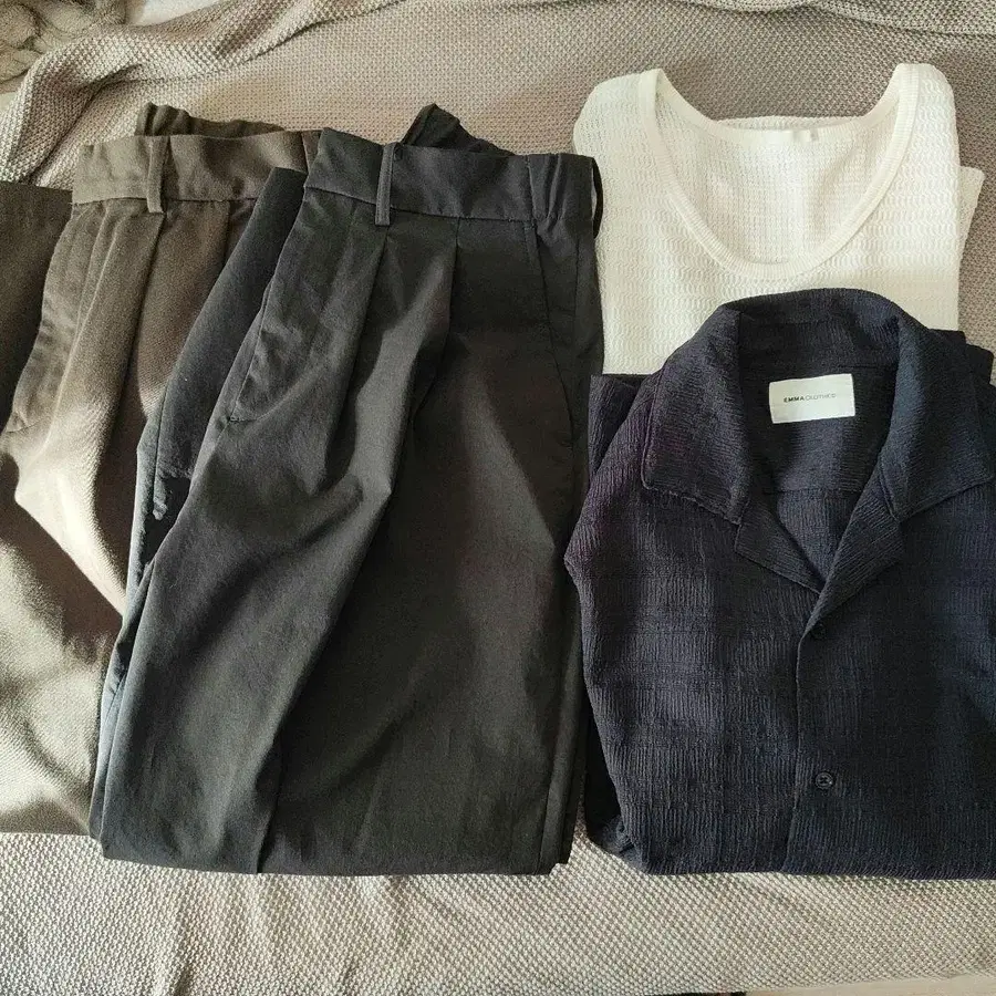 gu의 턱 치노 팬츠와 탱크탑 wym의 HARD GABA LOOSE FIT TROUSERS 에마 로즈의 반팔 셔츠 4종 세트입니다.