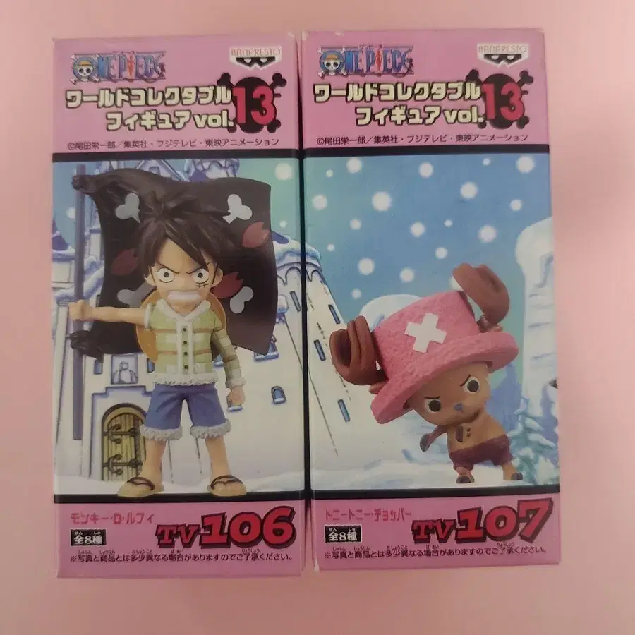 원피스 피규어 세트, 루피와 초파 - 시리즈: 월드 컬렉터블 피규어 vol.13 - 캐릭터명: 몽키 D 루피 - 캐릭터명: 토니토니 초파 - 부속품: 피규어 2체 세트입니다. 루피가 들고 있는 깃발을 비즈로 장식했습니다. 잘 부탁드립니다.
