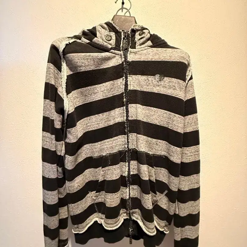 프란시스토모크스의 블랙과 그레이 스트라이프 디자인의 후드 부착 후드티. - 색상: 블랙과 그레이 스트라이프 - 디자인: 후드 부착, 지퍼 개폐 방문해 주셔서 감사합니다.