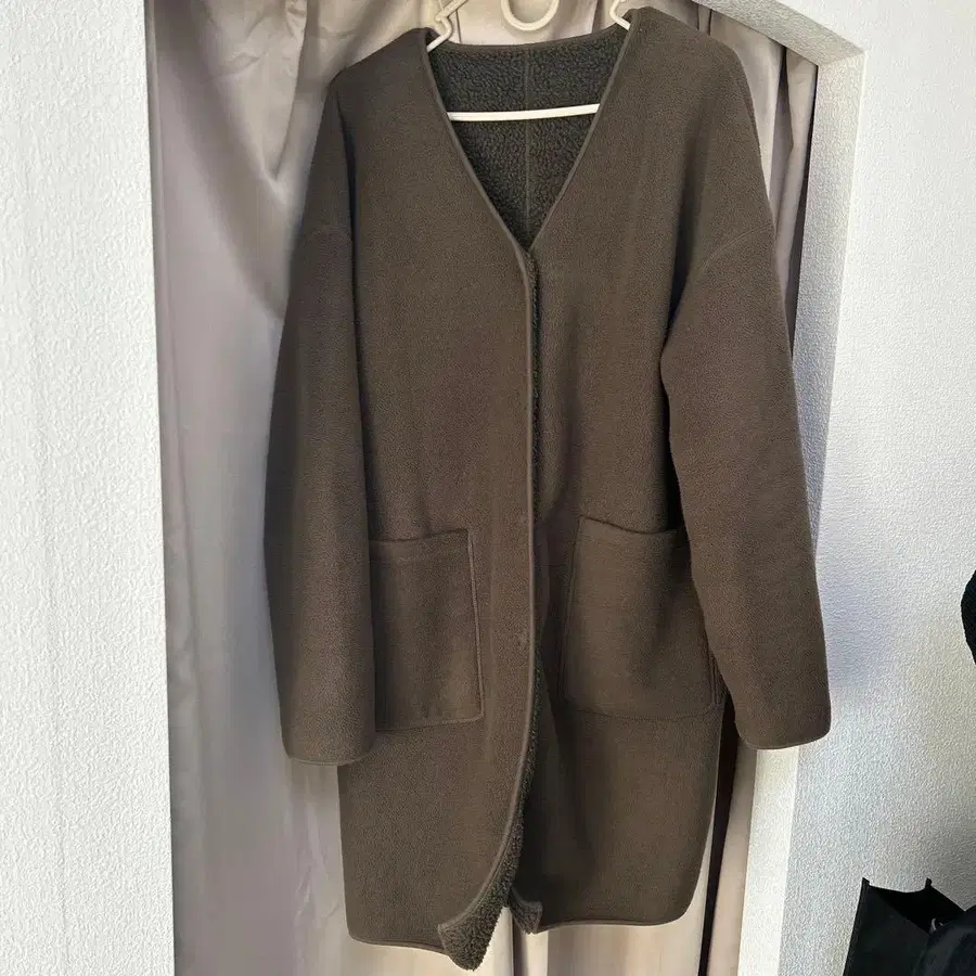 부드러운 플리스 소재의 브라운 자켓, 오픈 프론트 디자인으로 쾌적한 착용감.