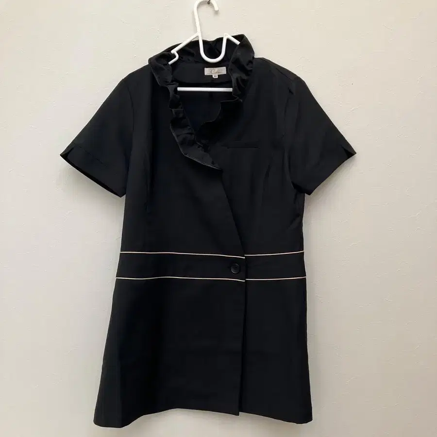 프릴이 달린 블랙 반팔 튜닉, 사이즈 11, 버튼 디자인. - 색상: 블랙 - 디자인: 프릴 포함 - 사이즈: 11 - 특징: 버튼 포함, 허리 라인 장식 폴리에스테르 100% 주름이 잘 가지 않고 세탁에 강합니다. 기장 79cm 폭 43cm 방문해 주셔서 감사합니다.
