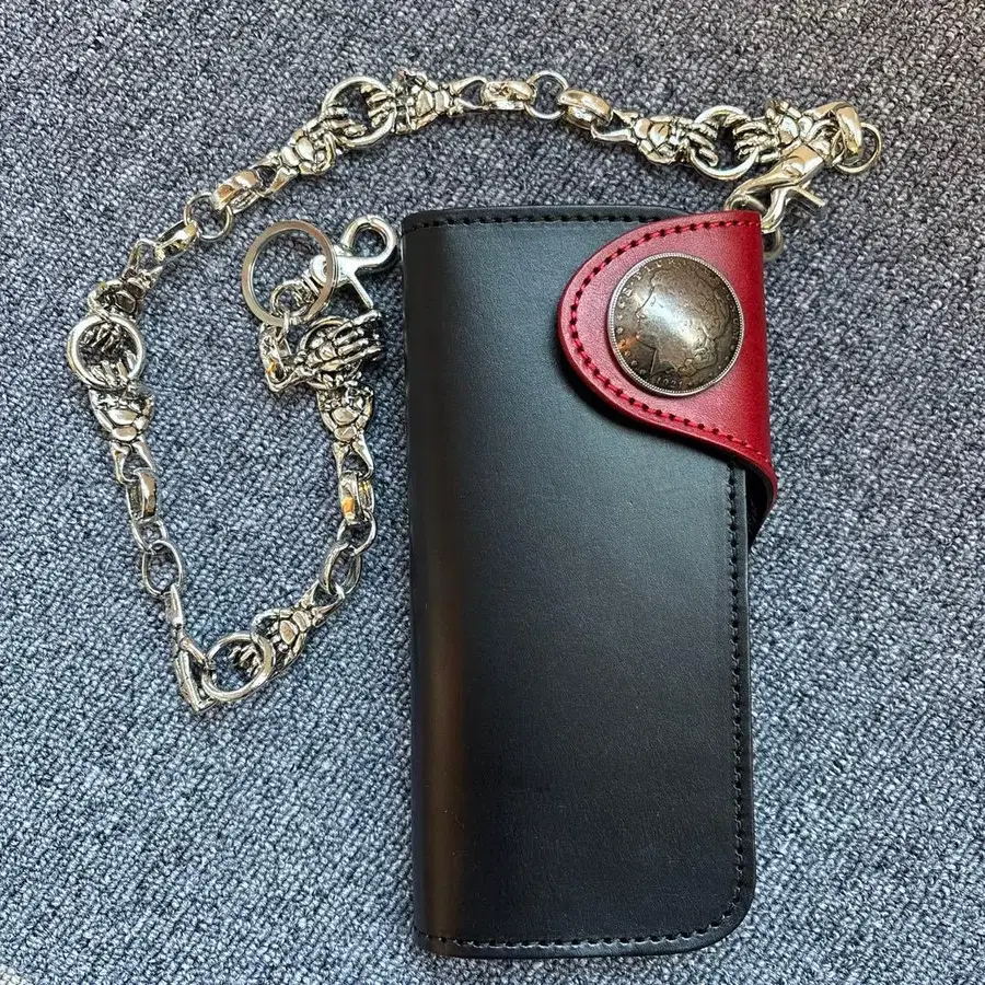 실버 체인 가죽 장지갑. 미사용 새상품이지만, 자택 보관했던 상품입니다. 가죽에 큰 흠집은 없으나, 미세한 흠집은 양해 부탁드립니다. 체인 길이 약 52cm 가죽 소재의 장지갑, 코인 포함 디자인, 실버 체인 포함. - 색상: 블랙/빨간색 - 소재: 가죽 - 디자인: 코인 포함 디자인 - 내부 구조: 카드 포켓, 지퍼 달린 포켓 있음 - 체인: 실버 체인 포함 방문해 주셔서 감사합니다.