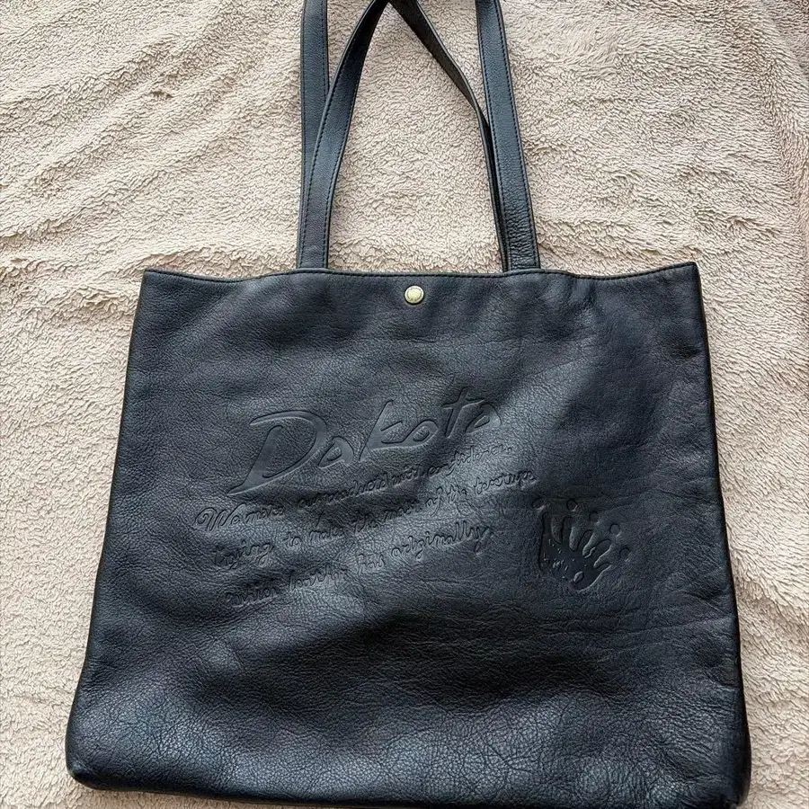 엠보싱 가공된 로고가 특징인 블랙 레더 토트백. - 브랜드: Dakota - 색상: 블랙 - 소재: 가죽 - 디자인: 엠보싱 가공 로고 - 스타일: 토트백 - 사이즈: 세로 31cm 가로 36cm 바닥 2.5cm 방문해 주셔서 감사합니다.