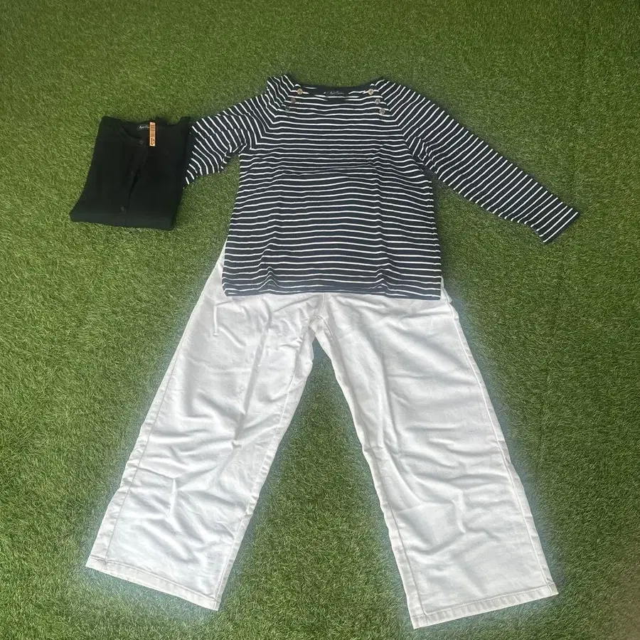 네이비와 화이트 스트라이프 긴팔 상의와 화이트 팬츠 세트업. - 상의 색상: 네이비와 화이트 스트라이프 - 팬츠 색상: 화이트 - 버튼 디자인: 골드 컬러 버튼 포함 - 상의 스타일: 긴팔 보트넥 - 세트 내용: 상의와 팬츠 세트 & 가디건 사이즈 - M