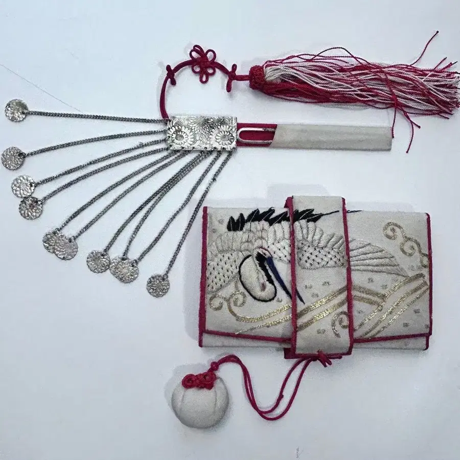학 자수가 놓인 아름다운 기모노 액세서리, 실버 장식이 특징입니다. - 소재: 실버, 실크 - 디자인: 학 자수 - 스타일: 기모노 액세서리 - 색상: 빨간색, 화이트, 은색 - 특징: 장식적인 태슬 포함 방문해 주셔서 감사합니다.