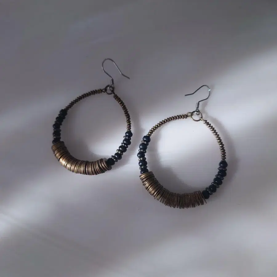 블랙과 골드 컬러 비즈를 사용한 후프 귀걸이. - 색상: 블랙과 골드 컬러 조합 - 디자인: 후프 귀걸이 - 소재: 금속과 비즈 - 사이즈: 중간 캐치, 스테인리스로 교환 직경, 5cm 방문해 주셔서 감사합니다. 컬러 - 블랙 계열 귀걸이 모양 - 링 후프