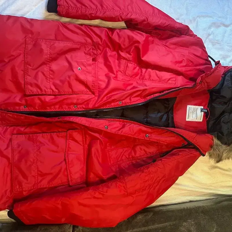 레드 색상의 후드 부착 다운 자켓, XL 사이즈, 앞면에 2개의 포켓 부착. - 사이즈: XL - 색상: 레드 - 디자인: 후드 부착, 퍼 부착 - 포켓: 앞면에 2개의 포켓 방문해 주셔서 감사합니다. 사이즈 - XL(LL)