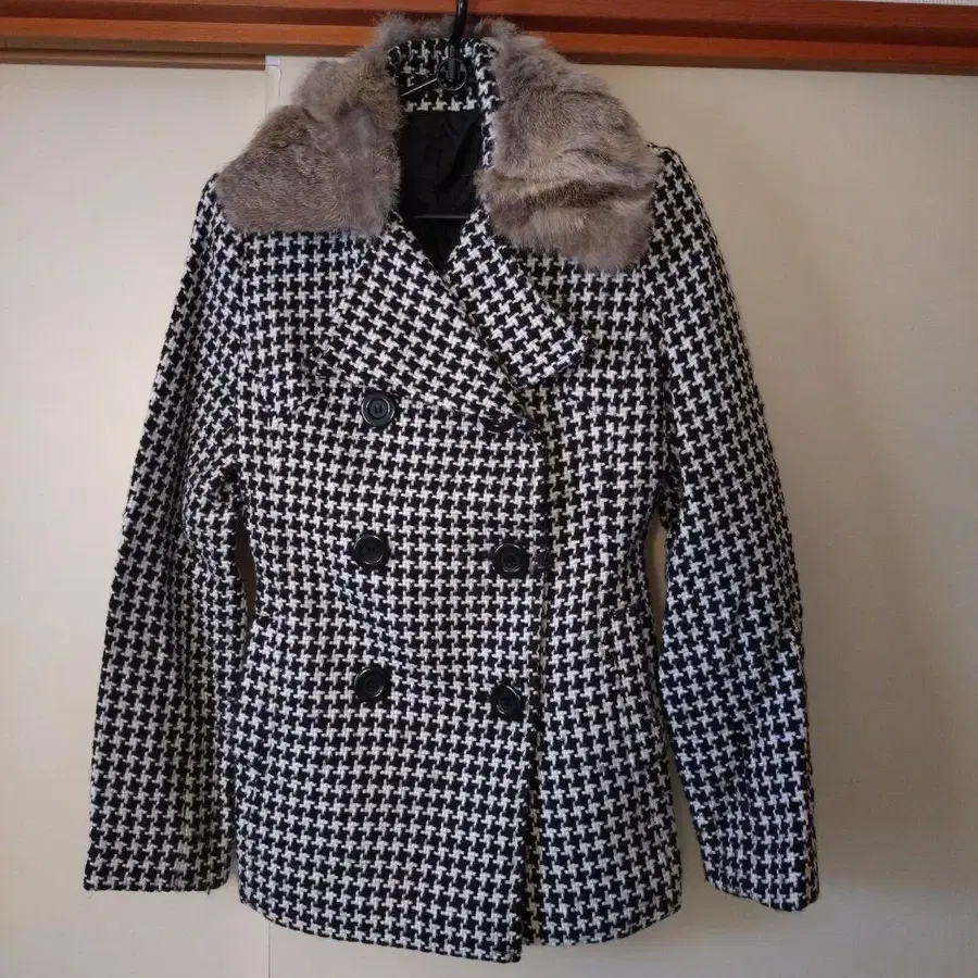 하운드 투스 패턴의 더블 브레스트 자켓, 퍼 카라 부착으로 스타일리시합니다. - 디자인: 하운드 투스 패턴 - 컬러: 블랙 화이트 - 옷깃: 퍼 부착 (탈부착 가능) - 스타일: 더블 브레스트 - 허리: 벨트 부착 방문해 주셔서 감사합니다.