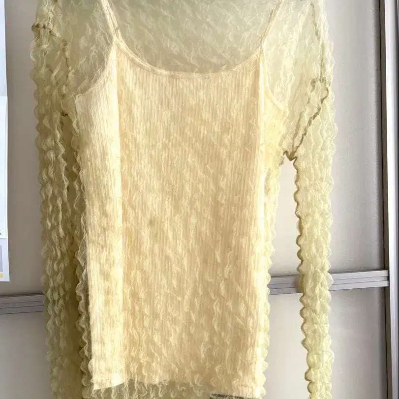 자동 번역되었어요. 원문보기연한 옐로우 컬러의 나일론 소재 긴팔 상의, 프리 사이즈로 가벼운 디자인.