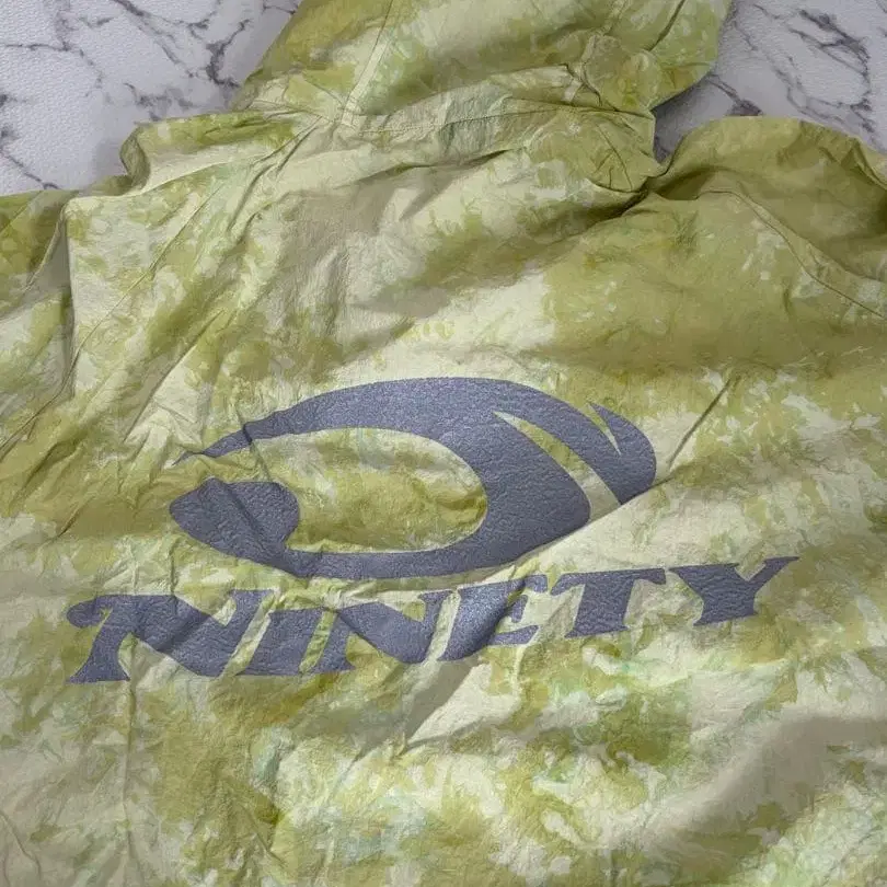 타이다이풍 라이트 그린 풀오버 나일론 자켓, 후드 부착 및 조절 가능한 코드 포함.