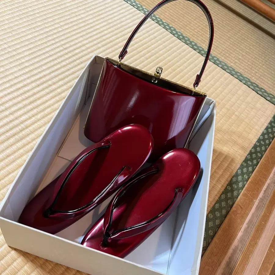 광택이 나는 와인 레드 색상의 조리와 백 세트. - 색상: 와인 레드 - 세트 내용: 백과 조리 세트 - 소재: 합성 피혁 - 디자인: 광택 있는 마감 - 특징: 바닥 부분에 미끄럼 방지 처리 방문해 주셔서 감사합니다. 색상 - 레드 계열 얼룩, 찢김, 냄새 등 - 없음 조리 옆면에 탁한 듯한 부분이 있지만, 닦으면 없어집니다. 성인식 때만 사용했으며, 이후에는 상자에 넣어 어두운 곳에 보관했습니다. 상자에 메모가 적혀 있어, 매직 등으로 검게 칠해서 보내드릴 것 같습니다.