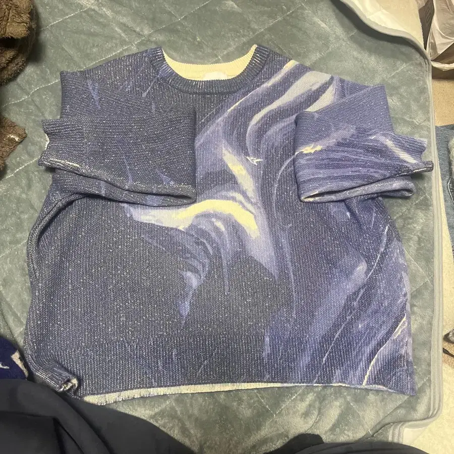 파랑 보라색 마블 무늬의 숏 슬리브 니트. - 색상: 파랑 보라색 마블 무늬 - 디자인: 숏 슬리브, 라운드넥 - 소재: 니트 - 스타일: 캐주얼 - 뒷면 디자인: 마블 무늬가 이어짐 방문해 주셔서 감사합니다.