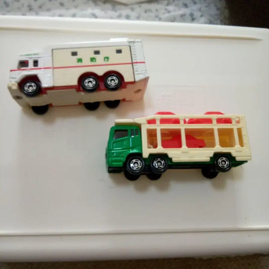 소방차와 트레일러 미니카 세트, 3축 디자인으로 위트 넘치는 상품입니다. 1996년 도쿄 소방청 슈퍼 앰뷸런스 NO.116 절판품, 1996년 미쓰비시 후소 NO.131 슈퍼 그레이트 절판품 모두 중국산입니다.