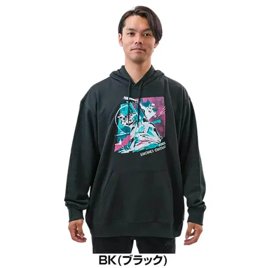 그래픽 프린트가 특징인 블랙 후디. 오타니 쇼헤이