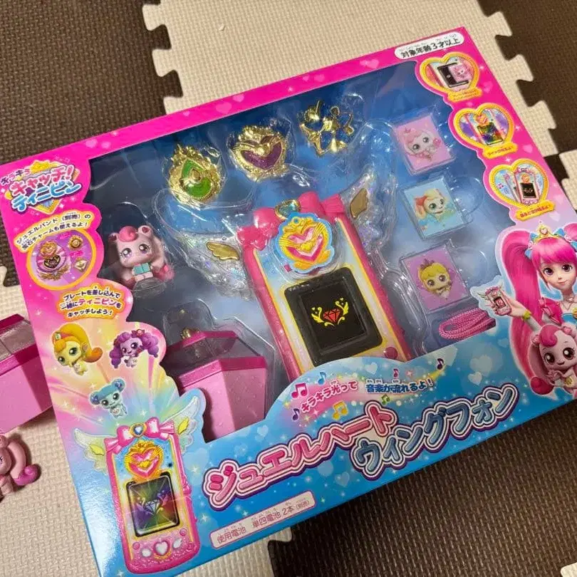 날개 달린 디자인의 핑크색 터치스크린 완구, 캐릭터 인형과 액세서리 포함.