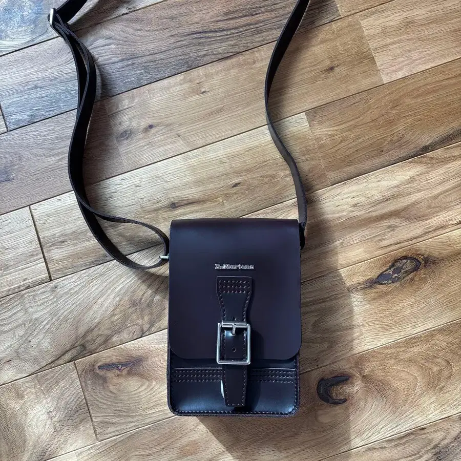 브라운 색상의 버클 플랩 디자인, 외부 포켓이 달린 Dr. Martens 숄더백.