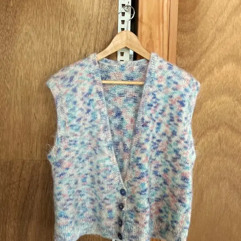 연한 블루, 핑크, 퍼플 계열의 믹스 컬러가 귀여운 빈티지 니트 베스트입니다.