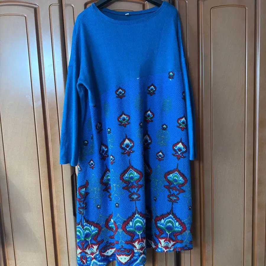 파란색 바탕에 다채로운 패턴이 들어간 긴팔 티셔츠 원피스. 사이즈 표기 없음. M 사이즈 상당 - 색상: 파랑 - 디자인: 패턴 - 소매 길이: 긴팔 - 스타일: 티셔츠 - 타입: 롱 원피스 방문해 주셔서 감사합니다.